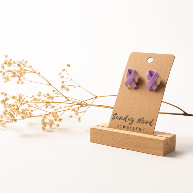 Mit unseren Awareness Ohrringen kannst du dein Statement setzten. Bestehend aus einem filigranes Cancer-Ribbon auf einem hellen Kreis. Die Ohrringe sind aus Polymer uns sind handgemacht.