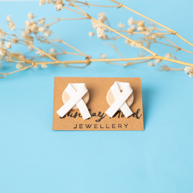 Mit unseren Awareness Ohrringen kannst du dein Statement setzten. Bestehend aus einem filigranes Cancer-Ribbon auf einem hellen Kreis. Die Ohrringe sind aus Polymer uns sind handgemacht.