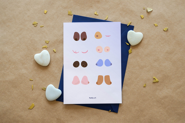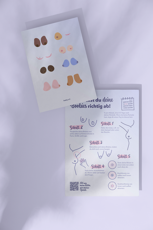 Mit unserer "Boobies abtasten" – Postkarte möchten wir euch die Möglichkeit geben, auf das Thema Vorsorge aufmerksam zu machen. Deswegen findet ihr auf der Rückseite eine Anleitung, wie ihr eure Boobies bzw. eure Brüste richtig abtastet. Diese könnt ihr euch zum Beispiel im Badezimmer an den Spiegelhängen, um euch oder andere regelmäßig an die Vorsorge zu erinnern.