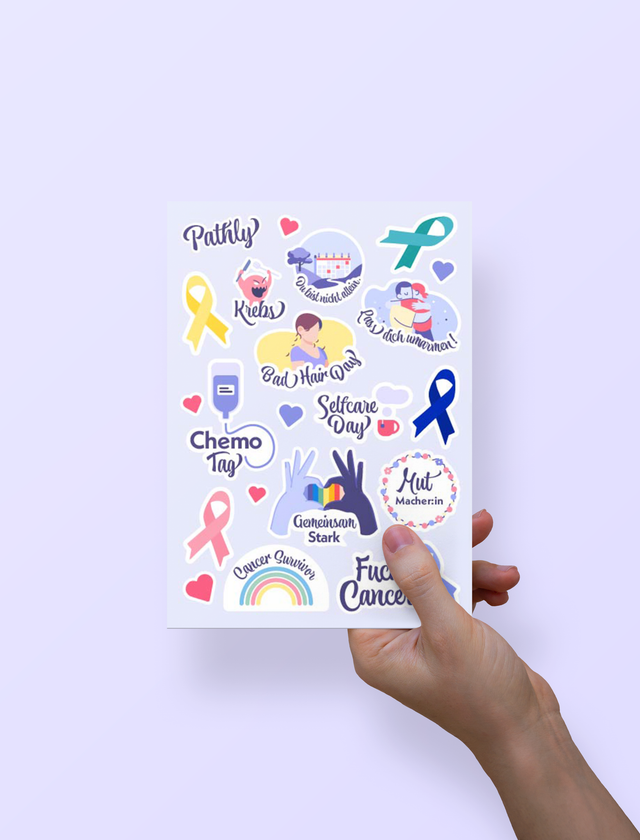 Mit unserem Stickerbogen für Krebsis möchten wir Krebspatient:innen während der Therapie Mut machen.